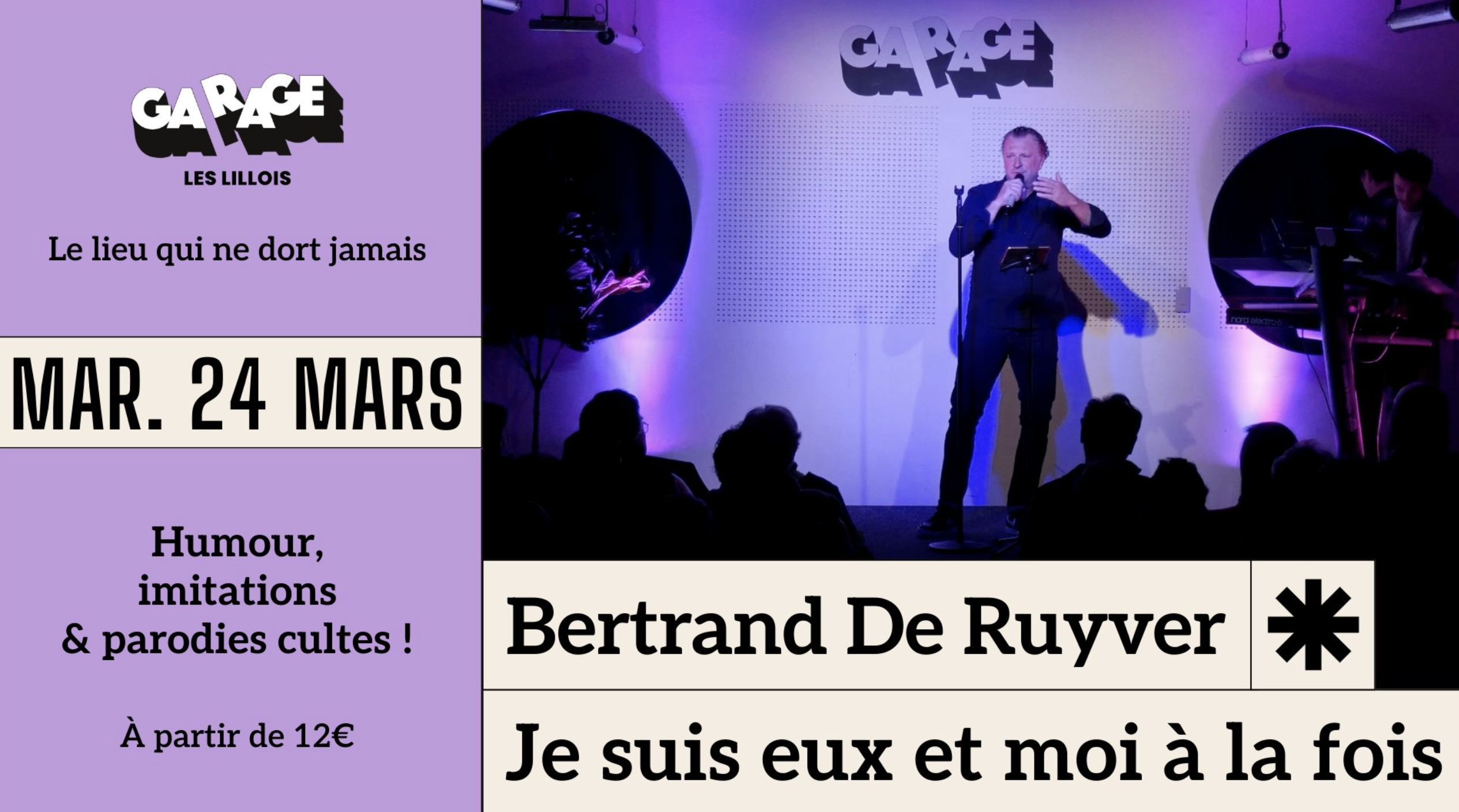 L'humoriste lillois Bertrand De Ruyver fait son grand retour au Garage avec son nouveau spectacle intitulé Je suis eux et moi à la fois. Ce show survitaminé promet une immersion totale dans son univers décalé où les parodies cultes et les imitations s'enchaînent avec une précision chirurgicale.