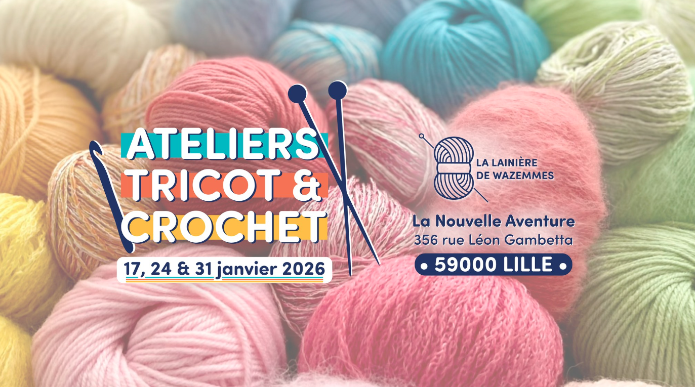 Résumé rapide : Des ateliers tricot et crochet à Lille spécialement pensés pour les débutants. Rendez-vous les samedis 17, 24 et 31 janvier 2026 de 10h à 12h à La Nouvelle Aventure pour apprendre en petit groupe dans une ambiance chaleureuse.