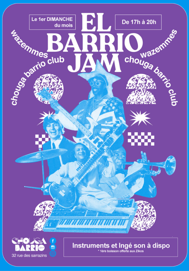 Le Chouga Barrio vous donne rendez-vous pour sa EL BARRIO JAM dominicale. Que vous soyez musicien amateur, professionnel ou simplement amateur de bonne musique, venez profiter d'une scène ouverte où la spontanéité est le maître-mot. Pour faciliter le jeu, un ingénieur du son est présent et de nombreux instruments sont mis à disposition des participants : guitare électrique, basse, clavier, batterie et micro.